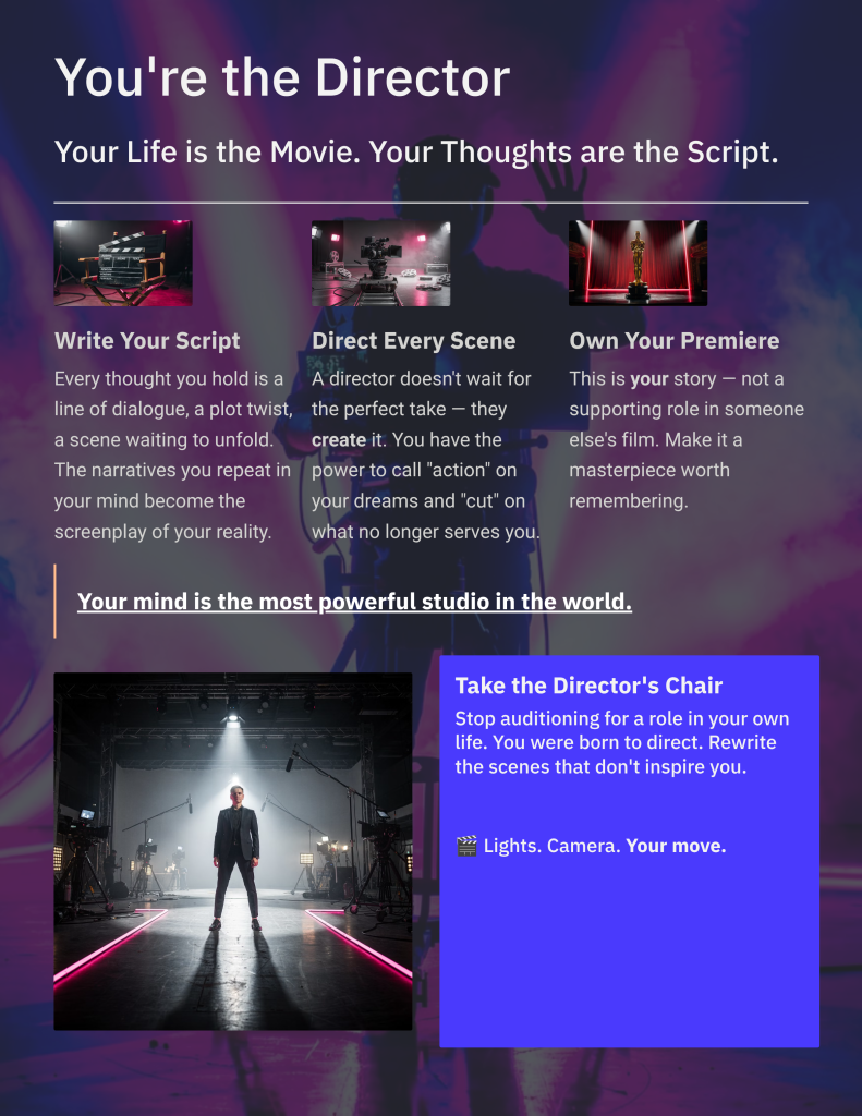 A: From the very first chapter, you’ll shift from feeling like a passive extra to an active Director. The “Director’s Takeover” steps in Chapter 2 are designed to create immediate momentum. This book is about claiming your “NOW” life—breakthrough begins the moment you decide to pick up the pen and write your new script.